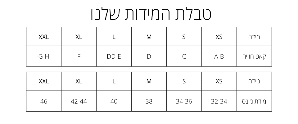 - במידה והמידה/גזרה לא מתאימה ניתן לבצע החלפה למוצר עד עשרה ימים מרגע רכישתו כל עוד לא נעשה בו שימוש, מדבקת ההיגיינה והטיקט במקומם והפריט נמצא במצב כמו שהגיע וניתן למכורו בשנית.